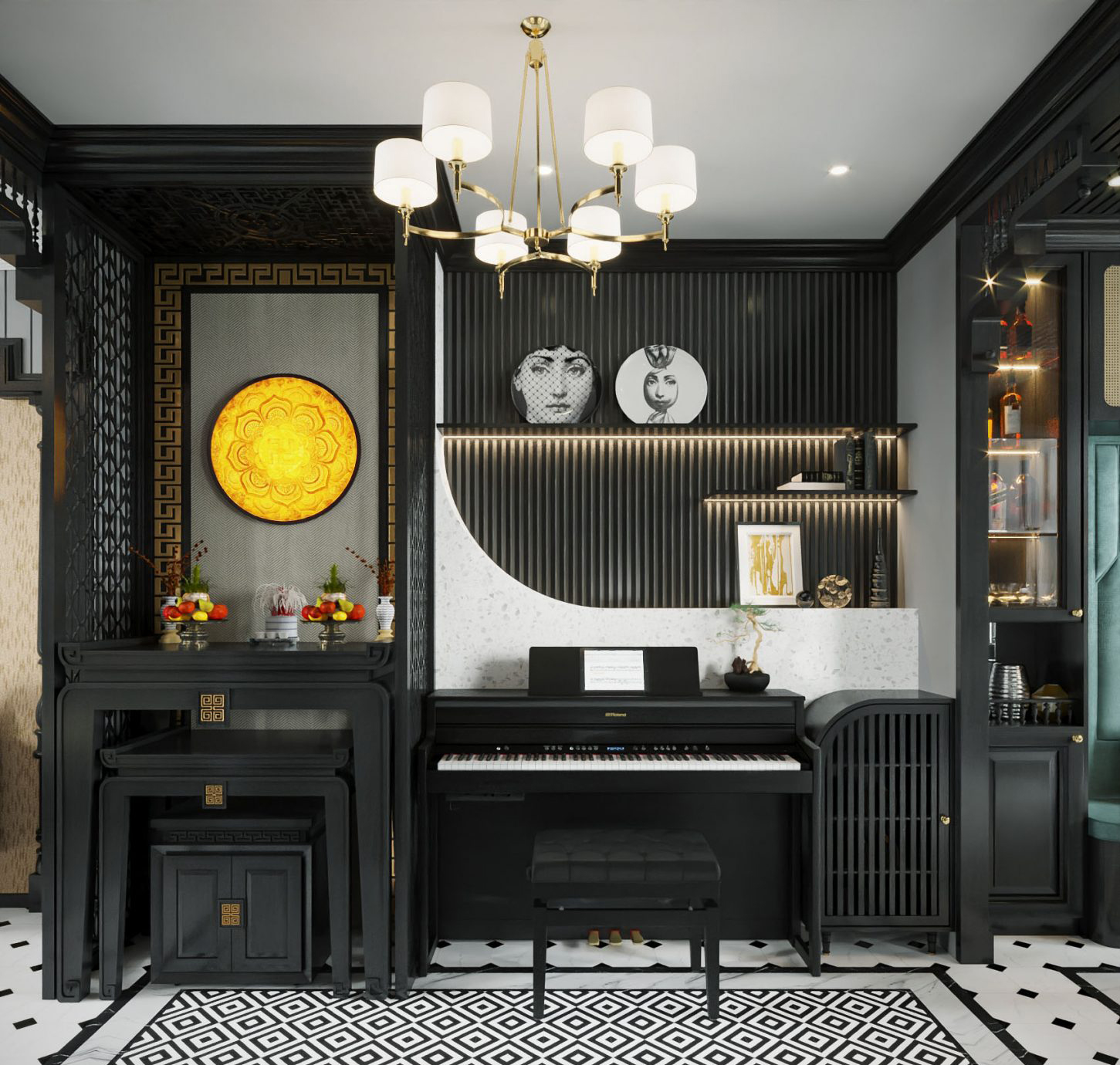 Từ phòng khách di chuyển qua phòng bếp chỉ cách vài bước chân. Tuy nhiên chủ nhân căn nhà không muốn lãng phí không gian nhỏ này. Anh Luân bày tỏ mong muốn mang đến chút nghệ thuật cho không gian bớt đơn điệu. Để tối ưu diện tích và công năng sử dụng, đội ngũ thiết kế đặt chiếc piano màu đen kết hợp kệ trang trí kiểu dáng hiện đại để lấp đầy khoảng trống. Bên cạnh đó, chủ nhà là người khá chú trọng đến nghi thức truyền thống, đội ngũ quyết định đặt khu vực thờ cúng tại đây. Thiết kế nhỏ, gọn với phần khung gỗ màu đen cùng tông với nội thất gỗ trong nhà.